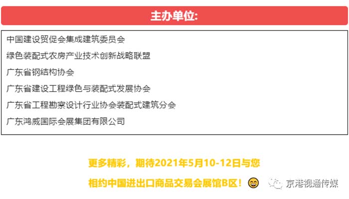 為了推進裝配式建筑領域的廣泛合作,助力粵港澳大灣區建設,由中國建設貿促會集成建筑委員會、綠色裝配式農房產業技術創新戰略聯盟、廣東省鋼結構協會、廣東省建設工程綠色與裝配式發展協會、廣東省工程勘察設計行業協會裝配式建筑分會、廣東鴻威國際會展集團有限公司等聯合主辦的,將于5月10-12日在中國進出口商品交易會展館B區11.1-10.1號館隆重舉辦,本屆吸引了近300家優質工程總承包供應鏈企業展示先進技術和產品,覆蓋裝配式建筑開發建設、設計施工、集成房屋、部品部件、裝配式裝修、裝備制造等產業鏈上下游全領域。